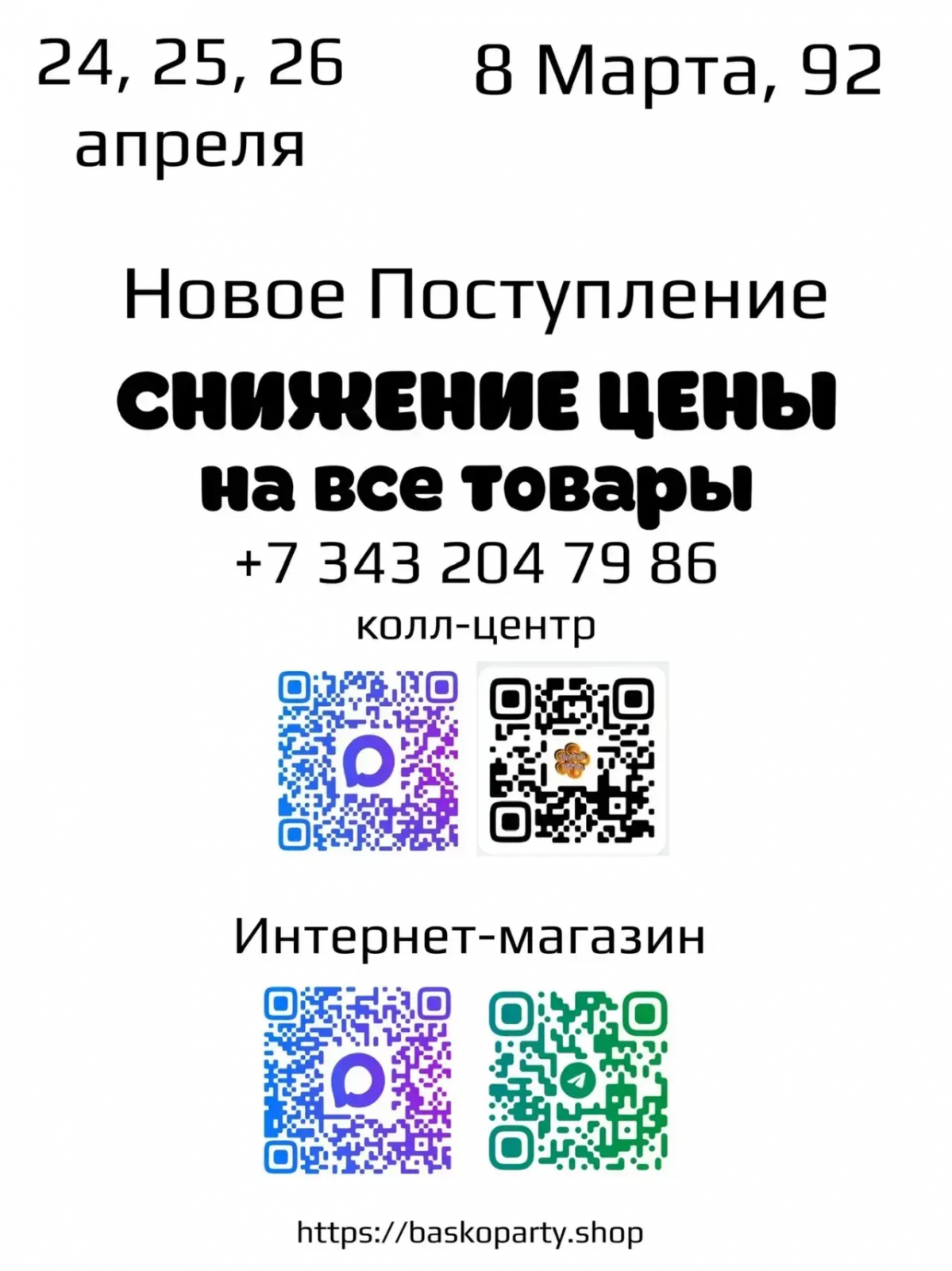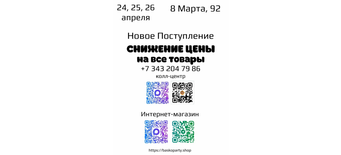 24, 25, 26 апреля НОВОЕ ПОСТУПЛЕНИЕ по СНИЖЕННЫМ ЦЕНАМ только на 8 Марта, 92!