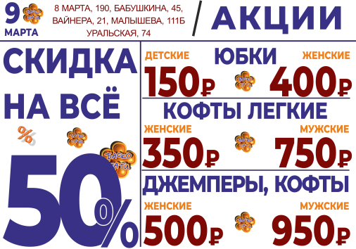 г. Екатеринбург: 8 Марта, 190, Бабушкина, 45, Вайнера, 21, Малышева, 111б, Уральская, 74.